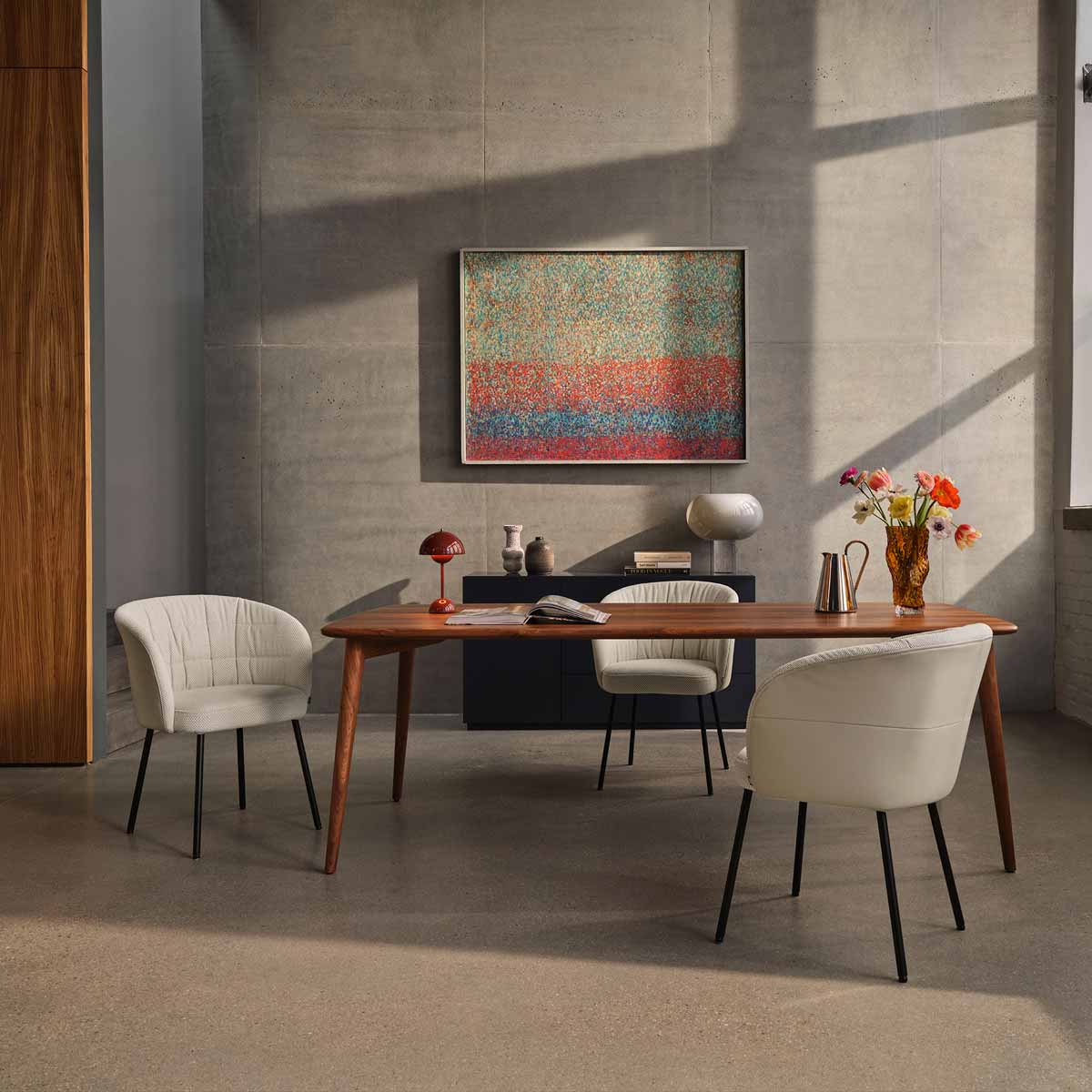 Dankzij het uitgebalanceerde ontwerp laat de Rolf Benz 900 zich eenvoudig combineren met verschillende soorten eetkamerstoelen. Plaatst u vollere, comfortabele stoelen rondom de tafel, dan ontstaat een warme en uitnodigende eetplek waar u urenlang comfortabel zit. De ronde en organische vormen versterken dit gevoel van zachtheid.